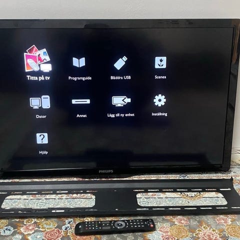 Philips tv i vit färg med fristående fötter och medföljande fjärrkontroll. Passar som tv eller bildskärm.