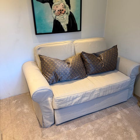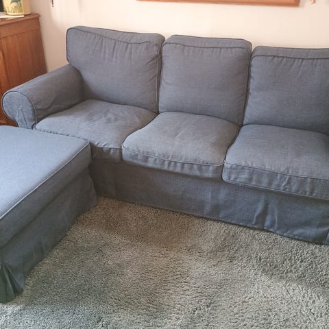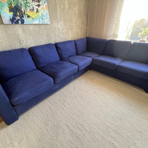 IKEA bäddsoffa med blå klädsel i tyg. Soffan består av flera sittdelar som bildar en L‑formad hörnsoffa med armstöd på båda sidor. Klädseln är avtagbar tygklädsel i blå färg. Passar för vardagsrum och liknande sällskapsytor där flera personer ska kunna sitta samtidigt.