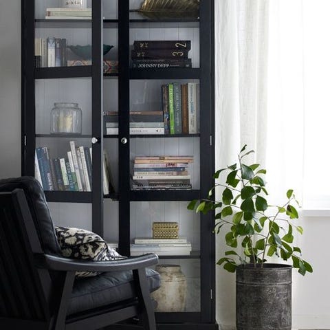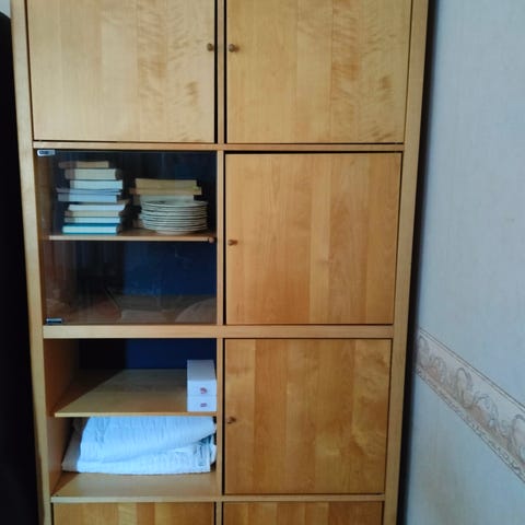 Skåp i fyra delar med två delar som är lådor, en del skåp och en del hylla. En övre del som är vitrinskåp.