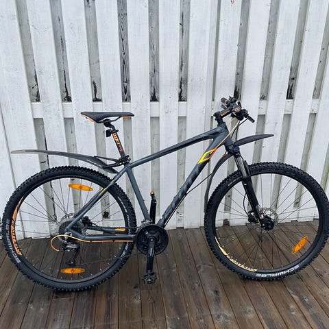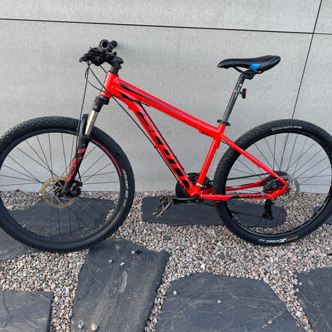 Scott 960 mountainbike för unisex med ramstorlek S. Cykeln har 29" hjul med grovmönstrade däck, lämpliga för terräng- och vinterkörning. Hård ramkonstruktion med framgaffel anpassad för mountainbikebruk. Utrustad med skivbromsar fram och bak. Färgen är röd med svarta detaljer. Låsbart ramlås med nyckel är monterat bak vid bakhjulet. Passar för stigcykling, pendling och allroundbruk i varierad terräng. Belysning fram och bak!