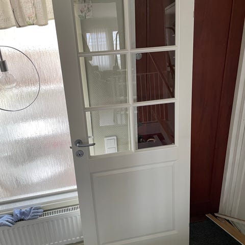 2st helt ny Bhumea innerdörr i vit färg. Dörrbladet har en enkel, klassisk spegeldesign och levereras inplastat. Passar som innerdörr i bostad eller liknande utrymmen. M8x20