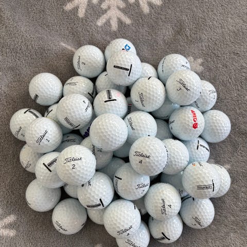 30st Titleist pro v1 och resten en blandning av Taylormade TP5 och Callaway chrome soft. Totalt 43 bollar, de flesta i A klass. Förekommer tuschpenna och reklam på en del bollar.