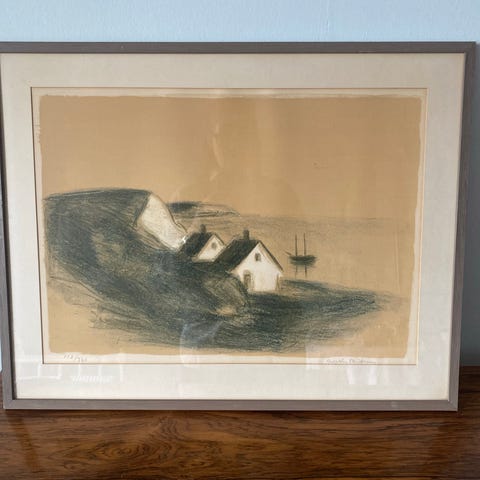 Inramad konstgrafik med kustmotiv som föreställer klippor, båtar och små hus vid vattnet. Verket är numrerat och signerad upplaga enligt märkning i nederkant. Tavlan är monterad med passepartout i en rektangulär ram med glas. Passar som väggdekoration i exempelvis vardagsrum, hall eller kontor.