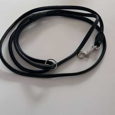 Stilrent och exklusivt utställningskoppel i svart med guldfärgad kedja.