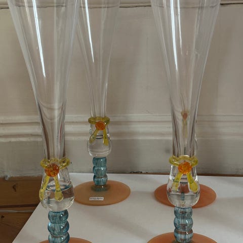 BIRGITTA WATZ. Konstglas, 6 delar, Lindshammar Glasbruk, handmålad dekor av solrosor, etikettmärkta samt signerade i måleriet. 4 pokalglas, höjd 17,5 cm, kupornas diameter 11 cm. 2 större glass samma design.