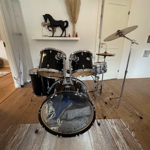 En smidigt trumset för övning (och kanske mindre gig). För närvarande sitter nätskinn på, men kan bytas till vanliga skinn. Virveltrumma är av okänt märke och baspedal är Yamaha. Säljes i det utförande och skick som syns på bilderna.