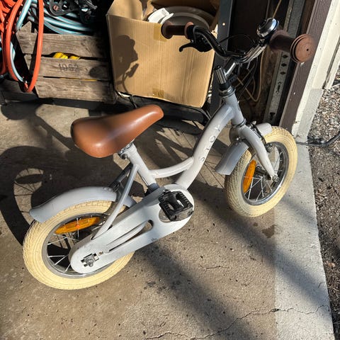 Barncykel med 12" hjul i lila och vit färg. Cykeln har stödhjul och kedjeskydd, bakbroms. Stödhjulen går att stälöa i oiika höjd.Passar mindre barn, ca 3-4 år. Sadel och styre är utformade för barnstorlek. Har förvarsts inomhus och är använd av 2 barn.
