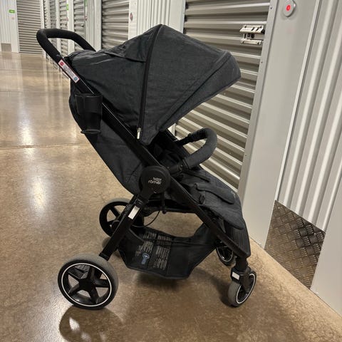 Vagnen har justerbart handtag med brunt överdrag. Till vagnen hör en svart liggdel.