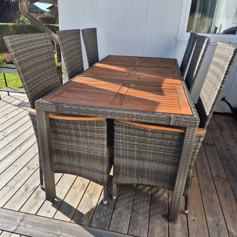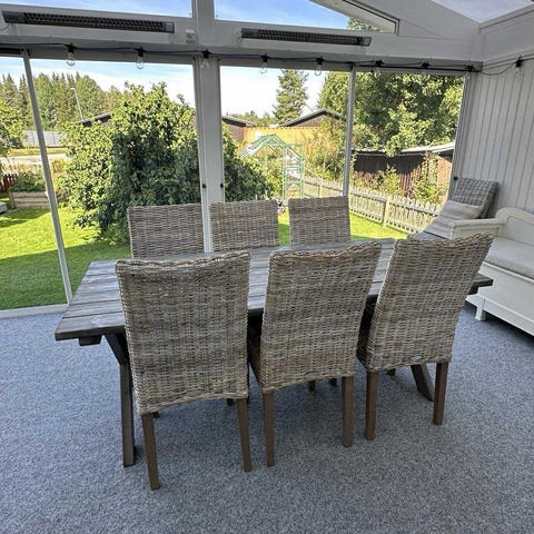Matgrupp bestående av rektangulärt matbord med träram och tre glasskivor samt flera högryggade stolar i flätad rotting i brunmelerad ton. Bordsskivan har glaspartier som ger en genomskinlig yta där rottingmönstret under syns. Stolarna har helklädd sits och rygg i samma rottingmaterial. Passar exempelvis i matrum, uterum eller på inglasad altan.