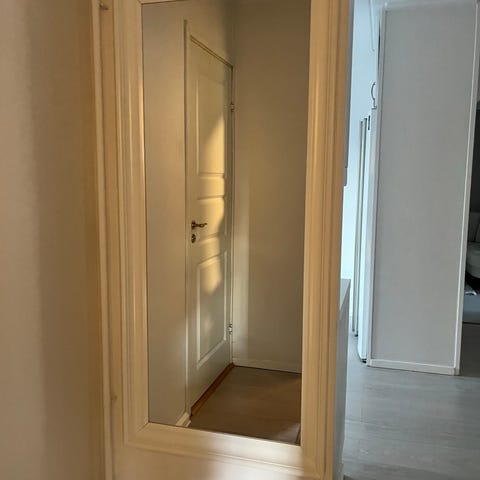 Robust spegel 150x40 i metallramen är tillsalu lika långe som du ser den här annonsen. Ej tung.Jag flyttar den utan problem från rum till rum. Nu står den på golvet i hallen men det finns en krok på baksidan - se bilden. För att transporteras från Farsta.