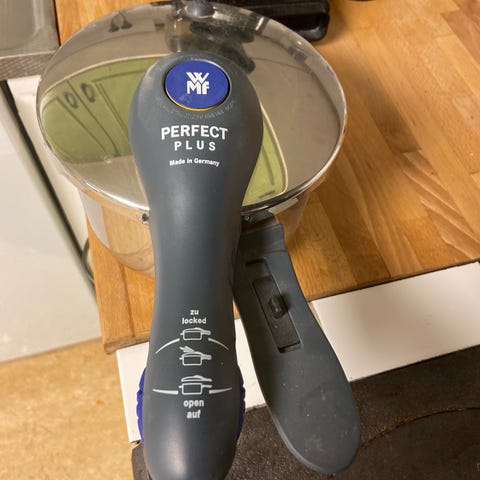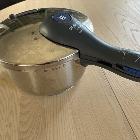 WMF Perfect Plus tryckkokare i rostfritt stål med volym 4,5 liter. Mycket sparsamt använd. Bok om tryckkokning på köpet.