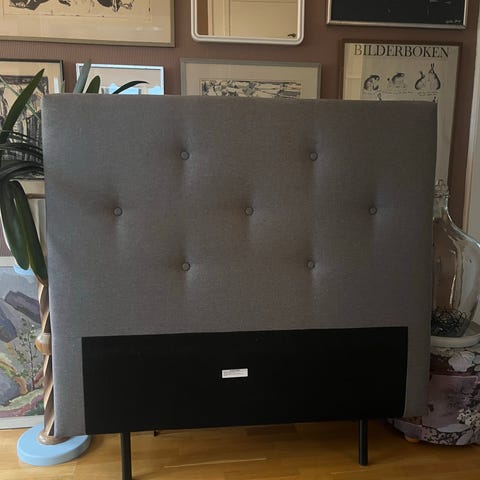 Mio sänggavel i grått tyg. Passar som huvudgavel till säng och placeras mot väggen bakom sängens huvudända. Neutralt utförande som fungerar i olika sovrumsmiljöer. Bredd 120 cm, höjd 85 cm, ben 17 cm.