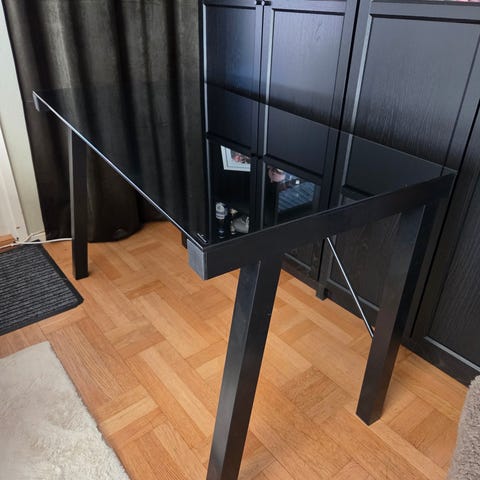 Ett svartfanerat skrivbord av modell "Idåsen" från Ikea med ett nät för kabellösningar under.