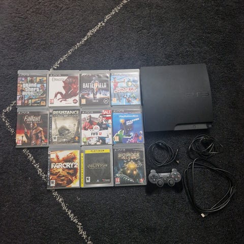 Sony Playstation 3 spelkonsol svart med handkontroller och spel
