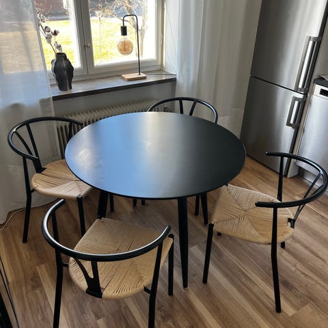 Säljer vårt matbord i trä med 6 stolar. Det är i fint skick och fungerar jättebra. Bordet går att förlänga med en extra skiva i mitten om man behöver mer plats, och sen kan man göra det mindre igen. Perfekt om man är familj eller ibland har gäster.