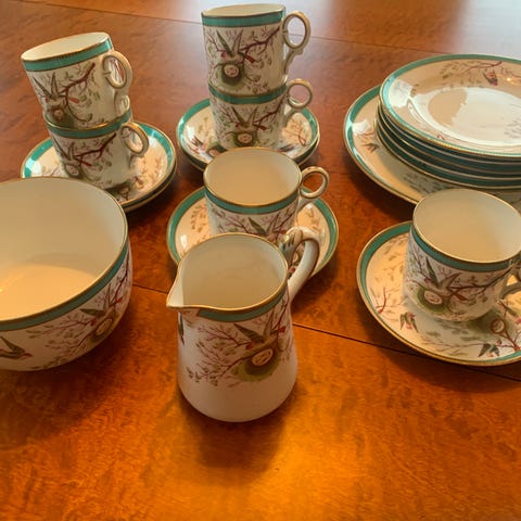 Mycket vackert porslin kaffekanna med tillhörande koppar, fat, sockerskål och gräddkanna med blommönster. Servisen består av kaffekanna med lock, sockerskål med lock, gräddkanna samt flera kaffekoppar med tillhörande fat. Passar för servering av kaffe i hemmet eller vid bjudningar.