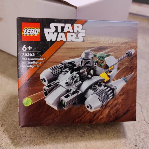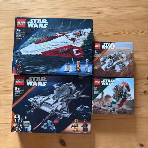 Oöppnad förpackning,LEGO Star Wars rymdskepp med minifigurer. Byggset med ett rymdskepp i vitt och grönt med öppningsbar cockpit och detaljerade motorer. Setet innehåller flera minifigurer med tillbehör som vapen. Passar för lek och som samlarobjekt för Star Wars-intresserade.