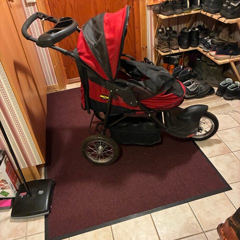 Barnvagn av jogger‑typ med tre hjul i svart tyg och metallchassi. Vagnen har fast framhjul, större lufthjul bak, fotstöd och justerbart handtag. Utrustad med sittdel med sele samt sufflett som ger skydd mot sol och lättare väder. Lämplig för promenader och lättare löpning på olika underlag.