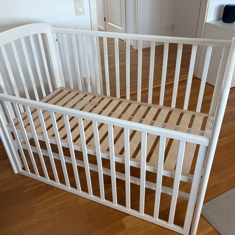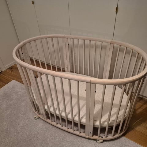 Stokke spjälsäng i vit färg. Oval form med ribbor runtom och öppningsbar sida. Sängen står på hjul vilket underlättar förflyttning i rummet. Vit madrass i ljus/vit färg utan fläckar.