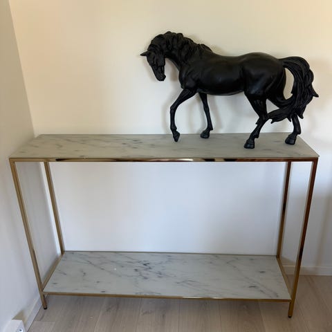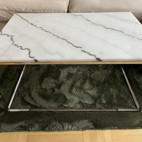 Sats med tre rektangulära satsbord med vit bordsskiva och underrede i metall med kromad finish. Väggspegel med fyrkantig form monterad på spets och dekorativ, vit ram med utskurna ornament. Soffa i grå textil med knapptuftad rygg, svängd sits och stoppade armstöd. Passar som komplett möbelgrupp i vardagsrum eller liknande sällskapsyta.