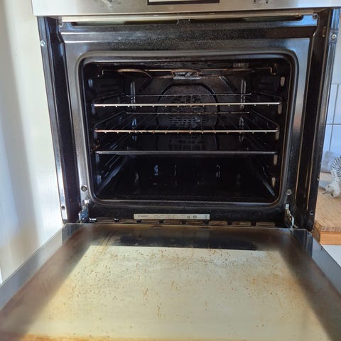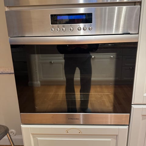 Varmluftsugn med praktisk utdrag av plåtar i luckan. Hel och i fint skick men behöver en rengöring.