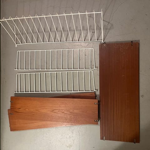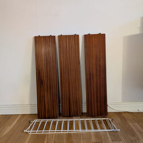 Äldre stringhylla i tre plan, fint skick men med lite skav - bild men genomgående smärre slitage. Vita gavlar. Hyllplan i teak.