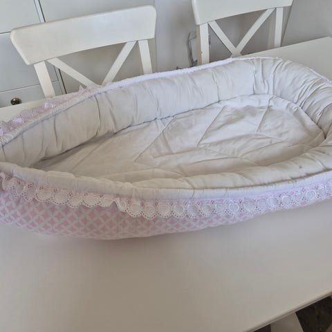 Säljer ett superfint handsytt babynest från Inge Mari med dekorativ spetskant.