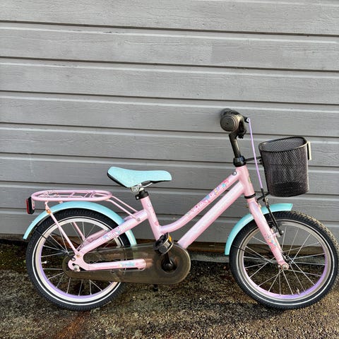 Peak barncykel med 16" hjul. Cykeln har ram i lila färg med rosa detaljer, korg fram och pakethållare bak. Utrustad med fotbroms bak och handbroms fram samt kedjeskydd. Passar barn som behöver en mindre cykel med 16-tums hjulstorlek för vardagscykling och kortare turer.