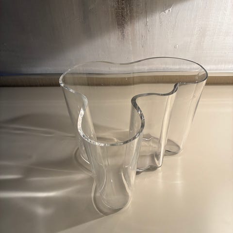 Iittala Aalto vas i klart glas. Organisk, vågformad design som kan användas som vas för blommor eller som dekorativ skål/behållare.