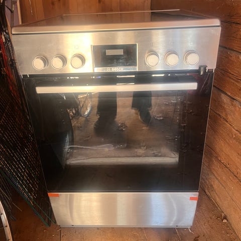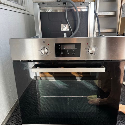 Inbyggnadsugn med varmluftsfunktion. Front i rostfritt stål med glaslucka och ugnsgaller/skenor invändigt. Passar för inbyggnad i köksskåp. Ugnstyp: varmluft. Övriga specifikationer som mått, effekt och modellbeteckning framgår inte av underlaget och bör kontrolleras vid behov.