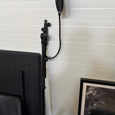 Apex kondensatormikrofon med tillhörande mikrofonarm i svart färg. Mikrofonen är monterad i en stötdämpande hållare (shock mount) och ansluts via kabel. Mikrofonarmen är justerbar och fästs i bordskant eller liknande yta. Utrustningen lämpar sig för inspelning av tal, streaming, podd eller annan hemmainspelning där en fast monterad mikrofon önskas.