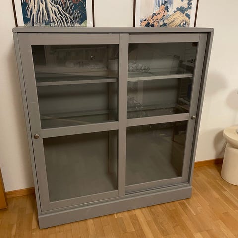 Ommålat vitrinskåp från ikea. Gångjärn behöver fixas och ett par hyllplan adderas, ev i glas?