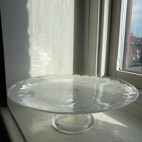 Snyggt tårtfat i glas på fot.