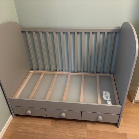 IKEA GODNATT spjälsäng med praktisk förvaringslåda under sängen.