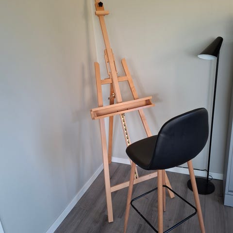 Staffli i trä med justerbar höjd och lutning. Passar för målarduk eller skiva i olika storlekar. Stabil konstruktion i ljust trä, lämplig för målning, teckning eller presentation i ateljé, skola eller hobbyrum.