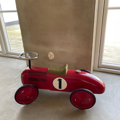 Röd gåbil med gummerade däck. Använd inomhus av sonen.