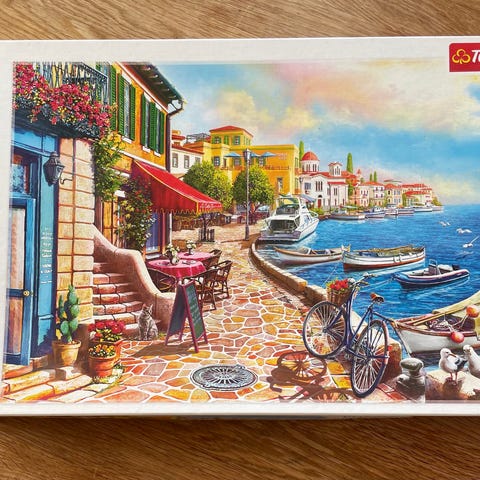 Clementoni pussel med 1000 bitar. Motiv med sjöutsikt och stadsmiljö sett från en terrass med bågar och växter. Färgrikt motiv med hus, vatten och båtar. Färdigt pussel mäter cirka 70 x 50 cm. Poster ingår enligt förpackningen.
