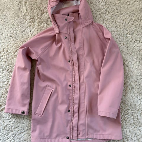 Rosa regnjacka med hästar på och i storlek 7år (ca 128) av märke Hatley. Tunna fleece lager på insidan för att hålla värmare under kallare vår dagar. Knappar (ej dragkedja) på framsidan.