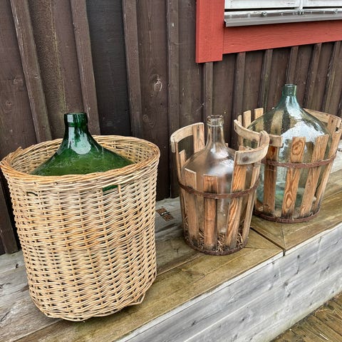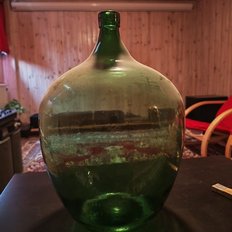 Dekorationsflaska i brunt glas. Höjd 47 cm. Inköpt på antikaffär (ej Markslöjd men gick inte att ta bort).