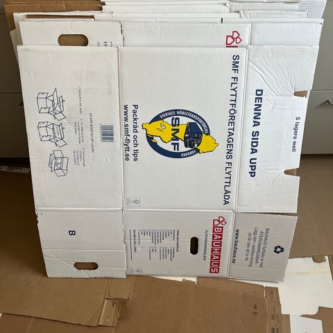 Här kan du köpa 21 flyttkartonger. Som du ser på bilden så är de här kartongerna stadiga. Köpta från flyttfirma och kraftigare än kartonger från tex Ikea eller Clas Ohlson.