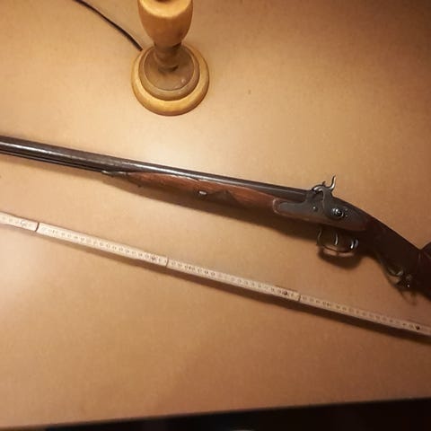Slaglåsgevär /Vallbössa tillverkad av Georg Zöffel Wiesenthal Tyskland 1680-1735 . Räfflad pipa med kaliber 19mm. Snälltryck . Omgjord till slaglås förmodligen i mitten av 1800talet . Rikligt dekorerad . Svans skruv lossad . Fungerar att skjuta med , se Youtube klippet i länken . Vapnet kräver ingen licens. Värderad till 20000 2024 . Svartkrut Flintlås Slaglås