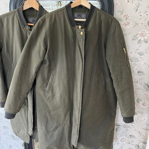 Grön poncho, vind och vattenavvisande, från svenska Margareta Forsberg. Storlek large. Axelvaddar, fickor, dragkedja fram. Kommer från rök- och djurfritt hem.