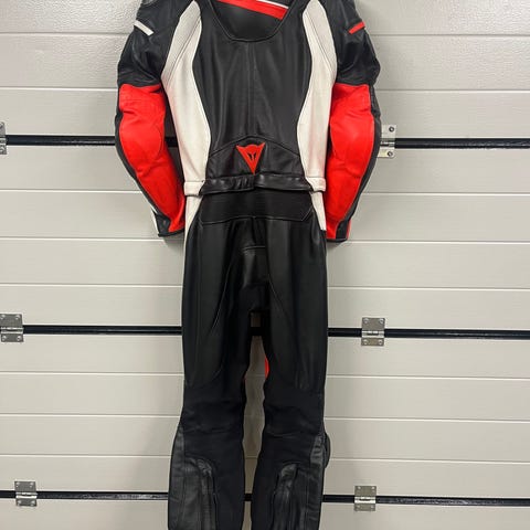 Dainese motorcykel skinnställ i svart/grå/röd läder. Tvådelat ställ med jacka och byxa som kan kopplas ihop med dragkedja. Väldigt lite använt, inga skador, ser mycket bra ut. Försett med förstärkningar och skyddspaneler på utsatta områden som axlar, armbågar, knän och höfter. Storlek 54 framgår av etiketten på insidan.