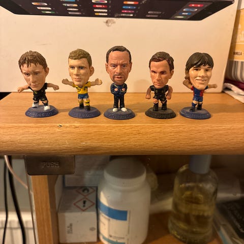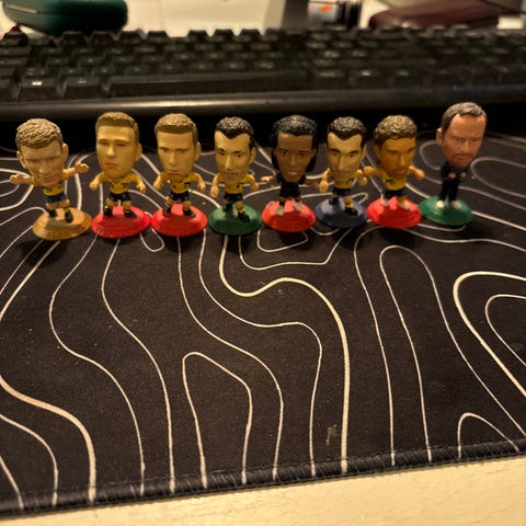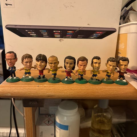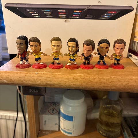 Samling med små minifigurer föreställande fotbollsspelare. Figurerna står på runda baser och bär olika matchställ i flera färger. Passar som prydnad, samlarobjekt eller lekfigurer. Storlek och material är ej angivna men figurerna är små och av hård plastliknande material baserat på utseendet på bilderna.