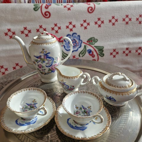 Porslin kaffeservis med koppar fat och assietter mönstrad