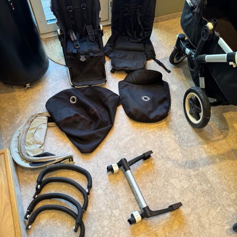 Följer med två sittdelar en liggdel och sidokorg, samt regnskydd
