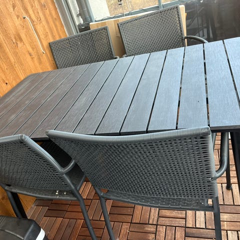 Hörngrupp utemöbel med bord. Soffan är utformad som en hörnsoffa med flera sittmoduler och grå dynor. Stommen är i svart metall. Till gruppen hör ett fyrkantigt bord med svart underrede och bordsskiva i glas. Passar för uteplats, altan eller balkong där man vill ha en samlad sittgrupp för flera personer.