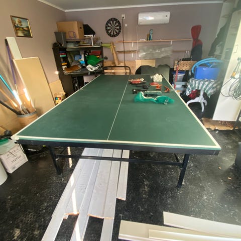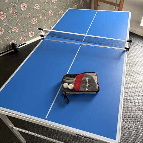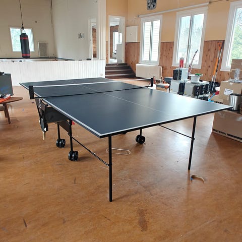 Konstruktionen är fällbar med delbara skivor som kan ställas upp för solo-/enskild träning. Bordet är utrustat med hjul för att underlätta förflyttning och förvaring i hopfällt läge. Metallram och stödben ger stabilitet under spel. ”