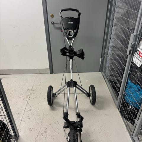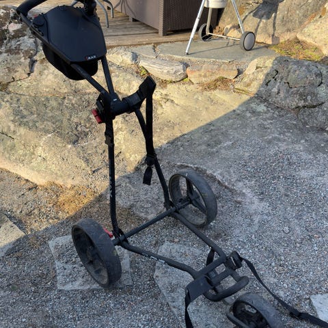 Golfvagn, trehjulig. Vagnen är hopfällbar.