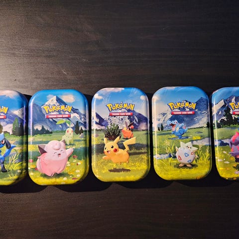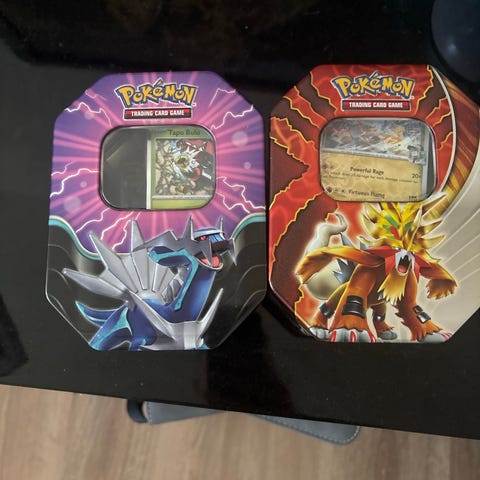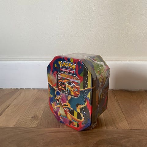 Pokémon Charizard Trading Card Game samlarplåtlådor. Två metallaskar med motiv av Charizard från Pokémon Trading Card Game. Varje ask innehåller ett urval av Pokémon-samlarprodukter kopplade till spelet, enligt informationen på baksidan av förpackningarna. Lämpliga för förvaring av kort och som samlarobjekt för Pokémon-intresserade.